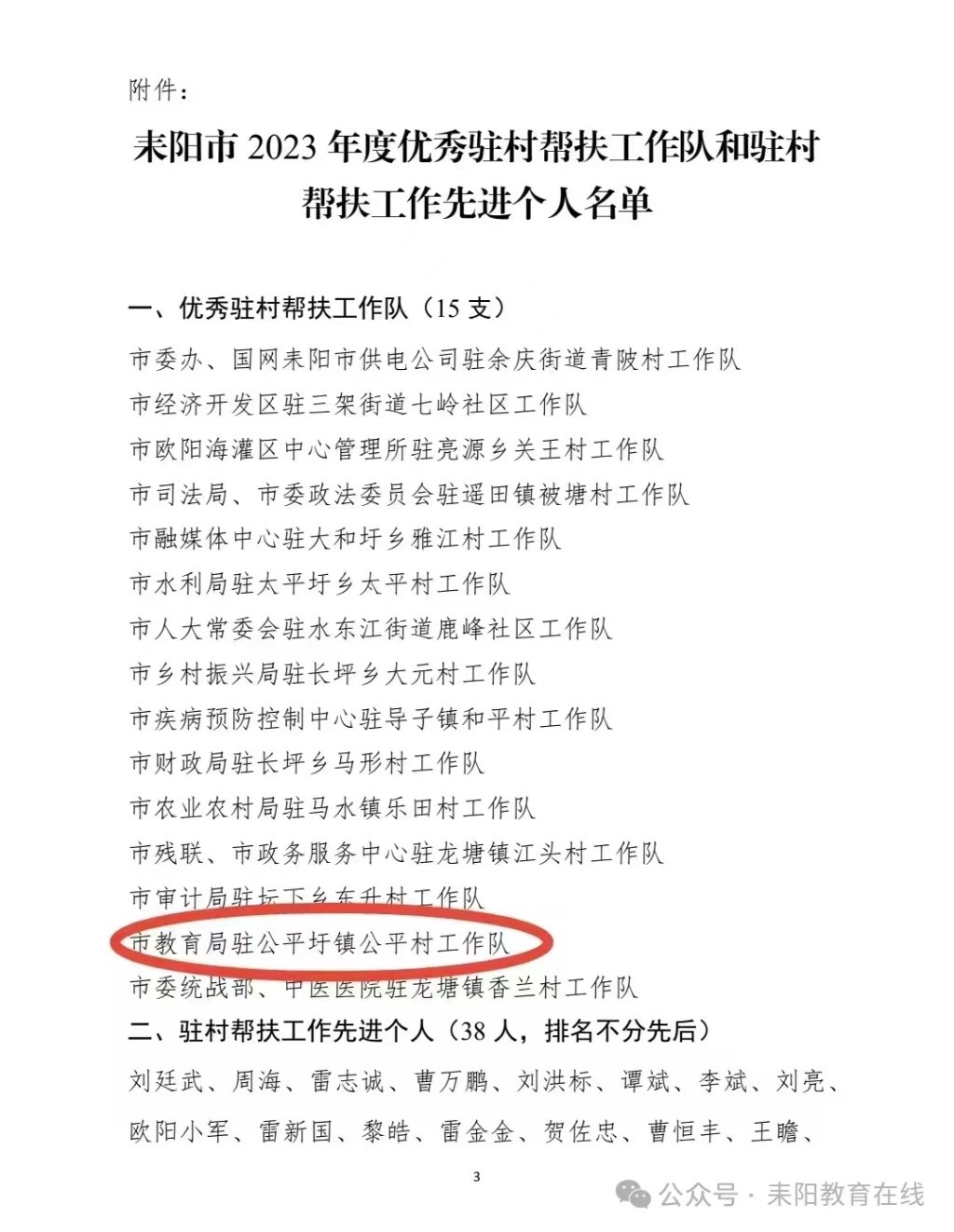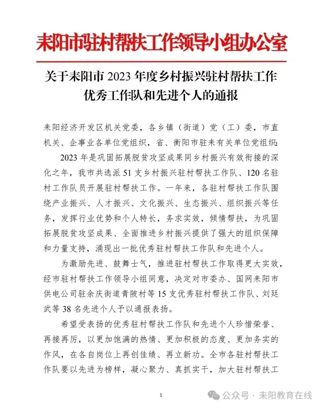 近日,耒阳市驻村帮扶工作领导小组办公室下发《关于耒阳市2023年度乡村振兴驻村帮扶工作优秀工作队和先进个人的通报》,耒阳市教育局驻公平圩镇公平村工作队被评为“耒阳市2023年度优秀驻村帮扶工作队”