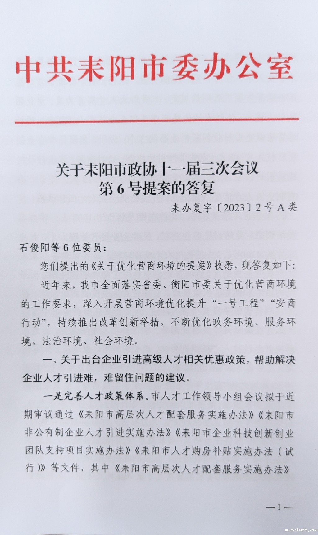 关于耒阳市政协十一届三次会议第6号提案的答复