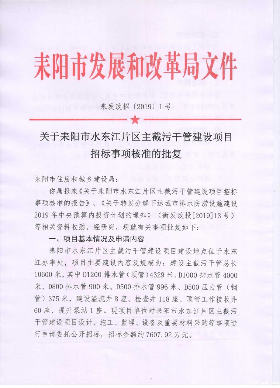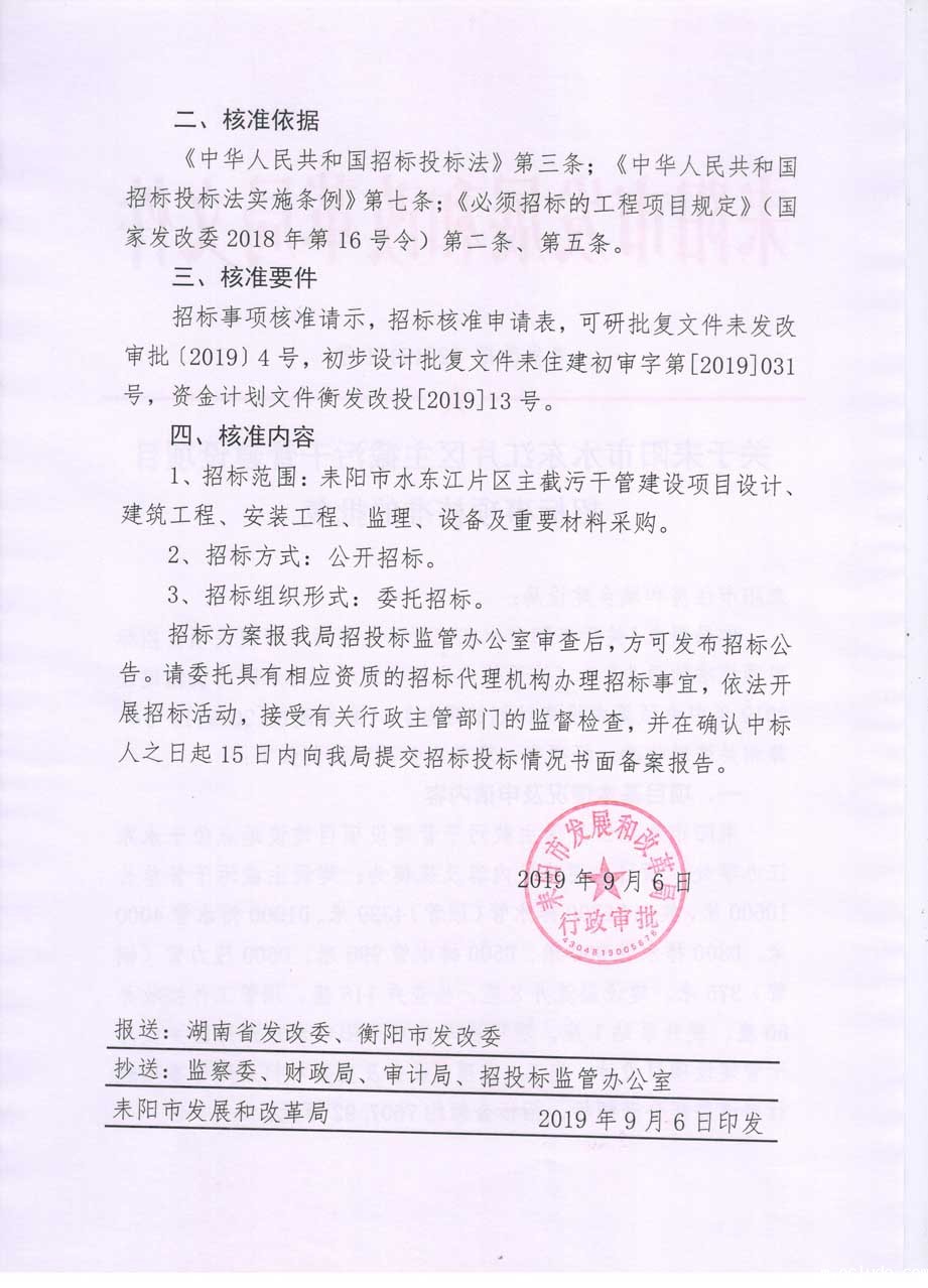 关于耒阳市水东江片区主截污干管建设项目招标事项核准的批复